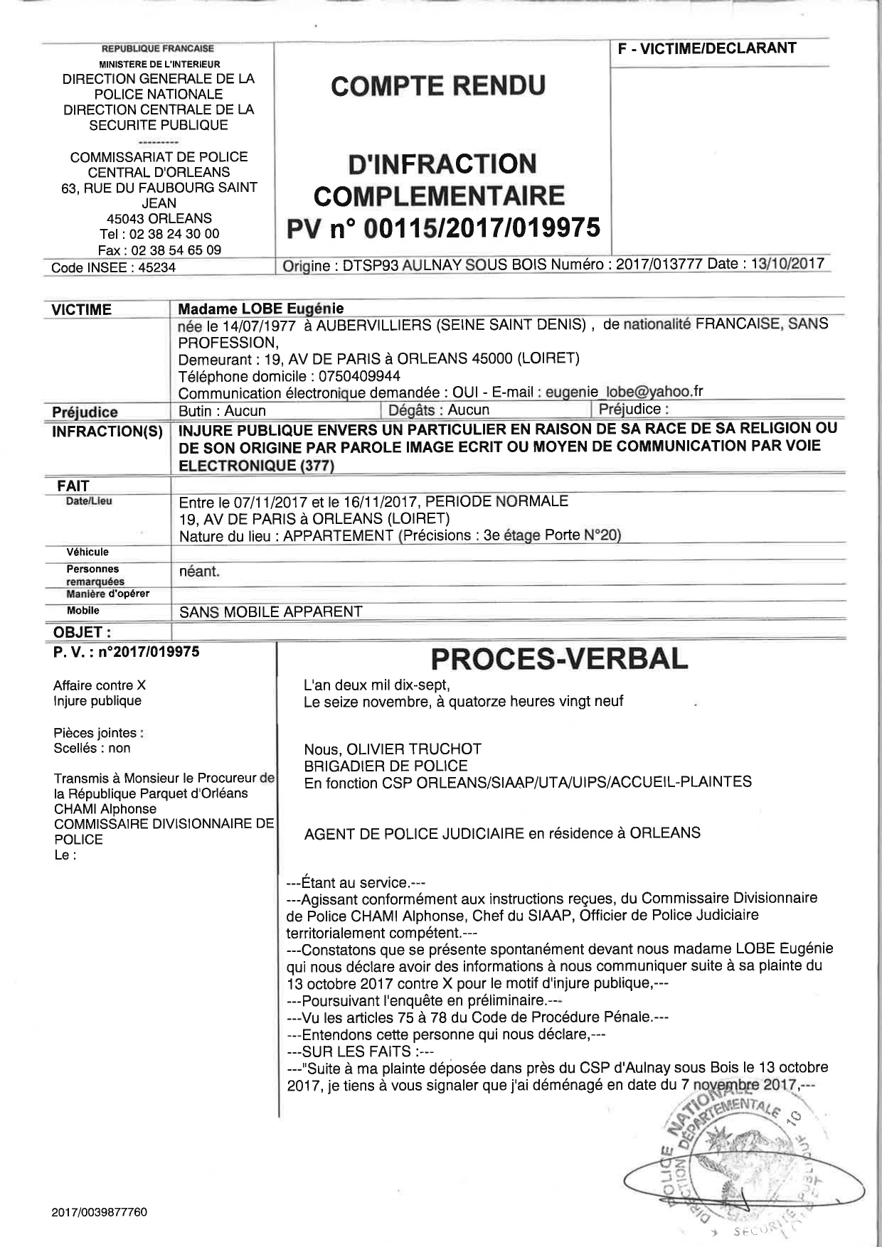 Je porte donc plainte dans ce commissariat, non sans difficulté (ils refusent dans un premier mais la condamnation du bâtonnier les y contraint, en quelque sorte.
