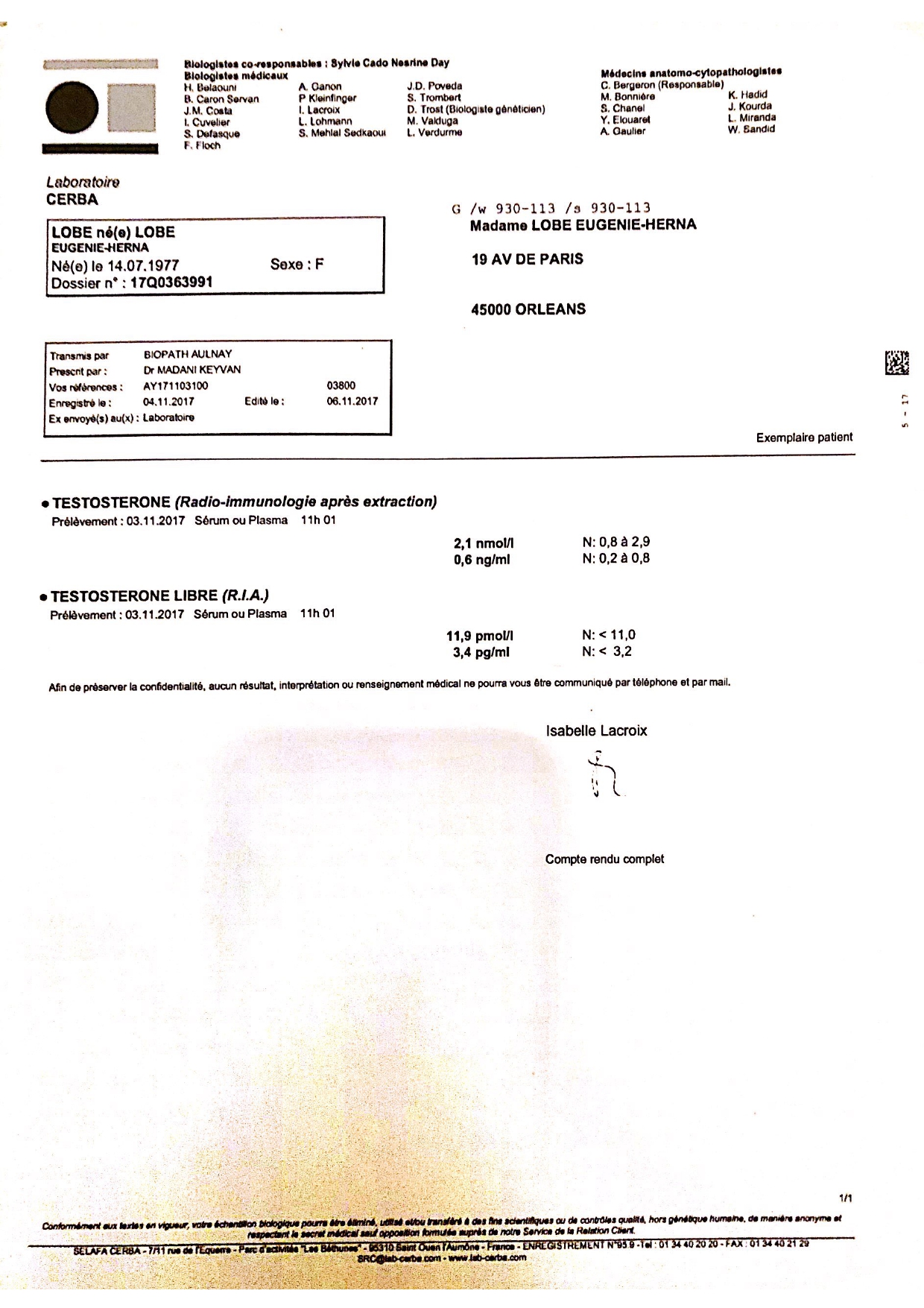 Vous trouverez mon compte-rendu d’hospitalisation à l’entrée de cet hôpital: il est bon. Je n’ai aucune pathologie. Ma sérologie est parfaite.