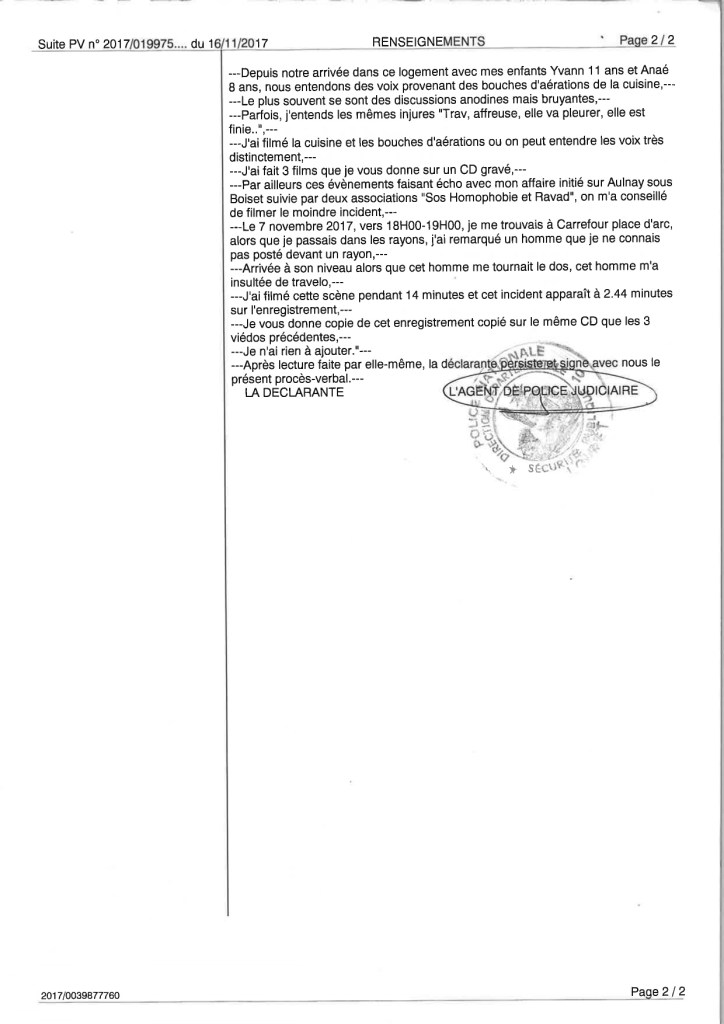 Il se déplace donc avec la victime suivant les territoires qu’elle traverse, en s’appuyant sur des relais et ressources en local. A Orléans, leur densité était moins importante, et en dehors du harcèlement de rue, des régulières violations de domicile et d’une fraude à l’eau, nous n’avons pas eu autant de problème que dans le 93. J’ai cependant pu enregistrer un épisode de harcèlement de rue, et le faire constater par voie d’huissier. La trame discursive est la même, mais elle changera après que j’ai envoyé ce PV d’huissiers au procureur qui dissipe toute ambiguïté sur les prétendus hallucinations auditives.