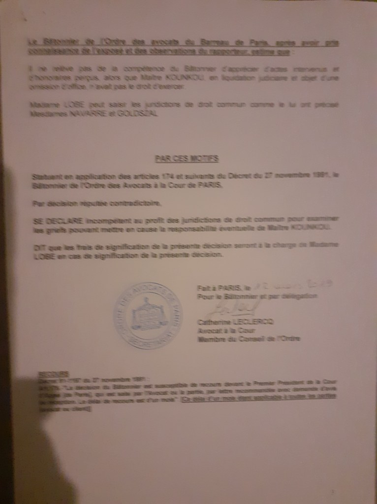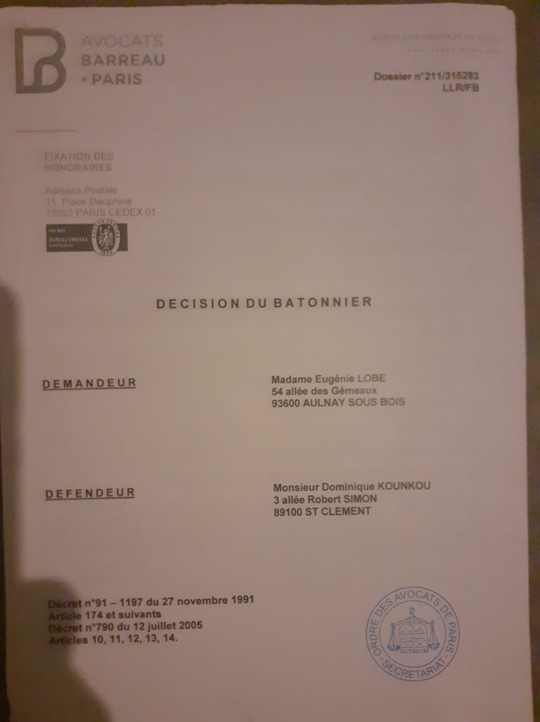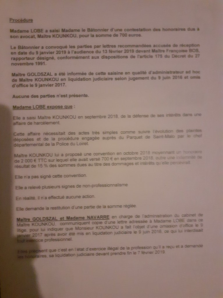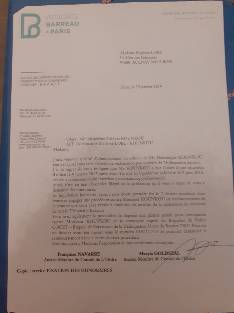 Par la suite, un brigadier de la répression des fraudes à Paris (17é) m’a auditionné, Mr Jérôme Chevignon, car je ne suis pas la seule victime de Maitre Kounkou. Je n’aurai pas de suite de l’enquête.