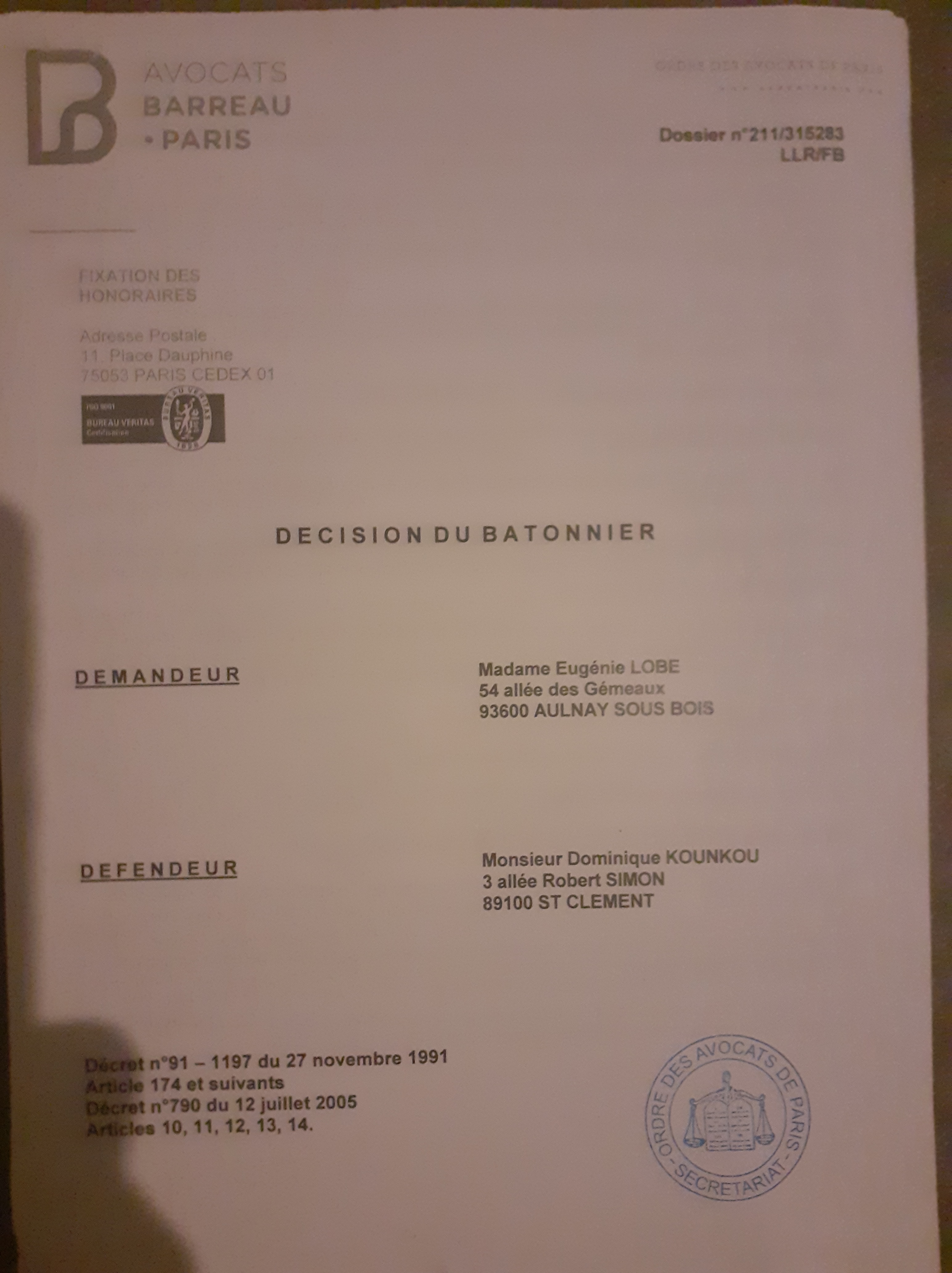 Il est donc condamné en 2019, mais le bâtonnier n’exige pas le remboursement de la somme perdue, et me renvoie vers le commissariat de mon lieu de résidence, à Aulnay s/bois..