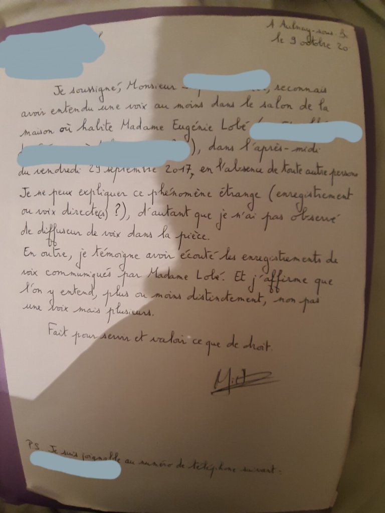 Suite à la main-courante, la forme de harcèlement devient plus insidieuse. Un dispositif acoustique est intégré: cela donne l’impression « d’entendre des voix ». Le dispositif est crée pour donner l’illusion de la perte de lucidité, et mime les hallucinations auditives, avec une rare perversion. Ayant une formation de sociologue et un appareil enregistreur à proximité, j’étudie la situation comme on le ferait pour un terrain: avec rigueur scientifique et j’enregistre pendant une heure. Les fréquences étant basse, c’est à peine audible, mais je réussis à le faire éclaircir par un ingénieur du son (qui disparaitra au moment d’être payé, alors qu’il m’avait relancé. Notons aussi que tous ses mails seront effacés par le réseau criminel).