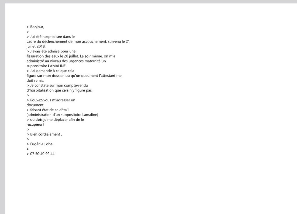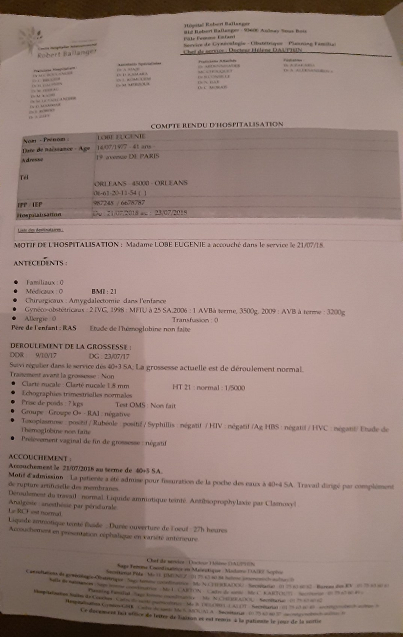 J’accouche donc à l’hôpital Intercommunal Robert Ballanger dans des conditions déplorables: On me donne un suppositoire interdit au 3éme mois de grossesse, sur un ton particulièrement ironique.
