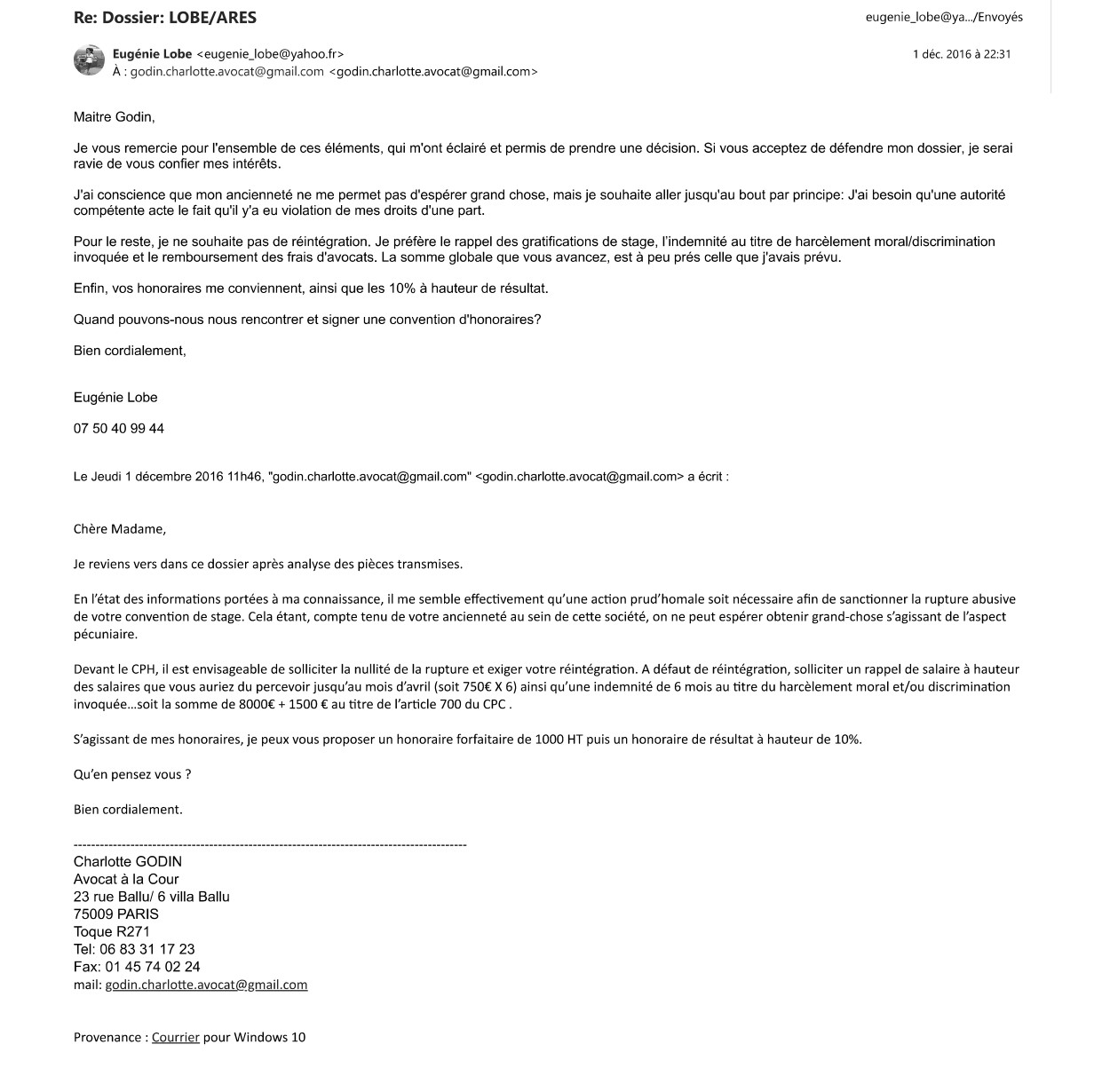 Si cela semble être un simple détail, le plus alarmant réside dans le fait que ces mails ont été effacés de ma boite mail (comme des centaines d’autres appuyant mon dossier. J’avais heureusement imprimé celui-ci!).